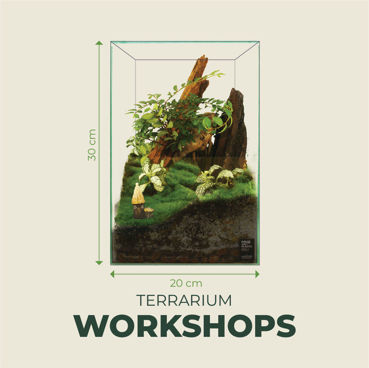 Inclusive of: 3x (S/M) figurines, 3x (M/L) driftwood/rock, 4x fittonia, 1x assorted bonsai & all necessary materials required