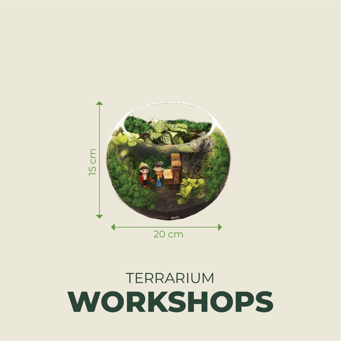 Inclusive of: 2x (S/M) figurines, 3x (S/M) driftwood/rock, 3x Fittonia & all necessary materials required